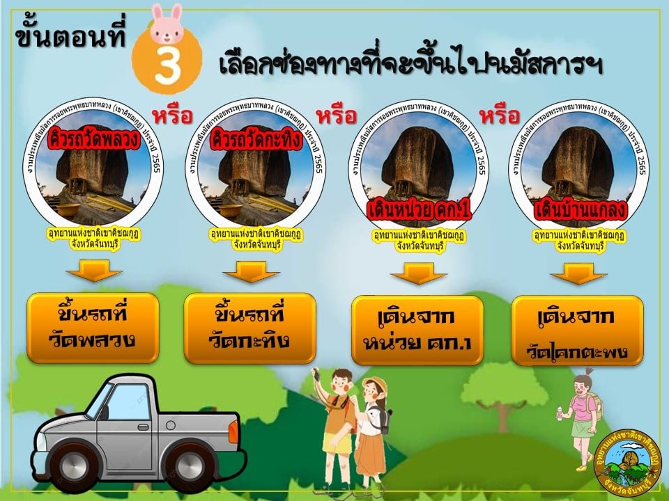 3. เลือกจุดขึ้นนมัสการ (มี 4 จุด คิวรถวัดพลวง คิวรถวัดกระทิง เดินหน่วยคก. 1 เดินบ้านแกลง)